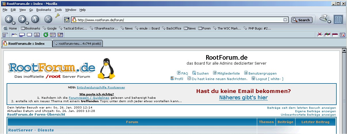 das mit dem Cache war auch mein erster Gedanke, also habe ich mal den IE genommen (den ich sonst nie nehme) und auch da war alles wie früher. Jetzt habe ich bei Mozilla gerade alles Caches geleert und die url rootforum.org/ von Hand eingegeben. Allerdings ist genau wie früher links das Frame mit den Buttons und oben Rechts ist keine Suchbox. Nur wie immer der Link zu phpBB Suchfunktion :(